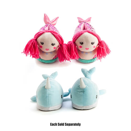 These plush slippers have so many cool details in the three dimensional design that really make them "stand out". Flame red wool mermaid hair, beautiful scales and arms on the mermaid and a single horn, flippers and tail on the narwhal. Both characters have embroidered eyes.